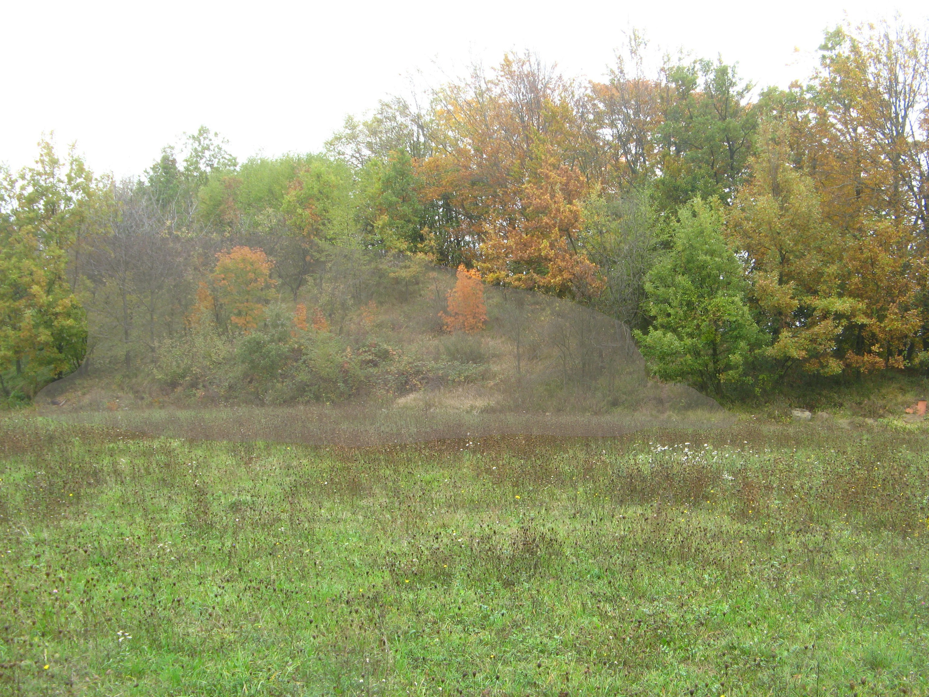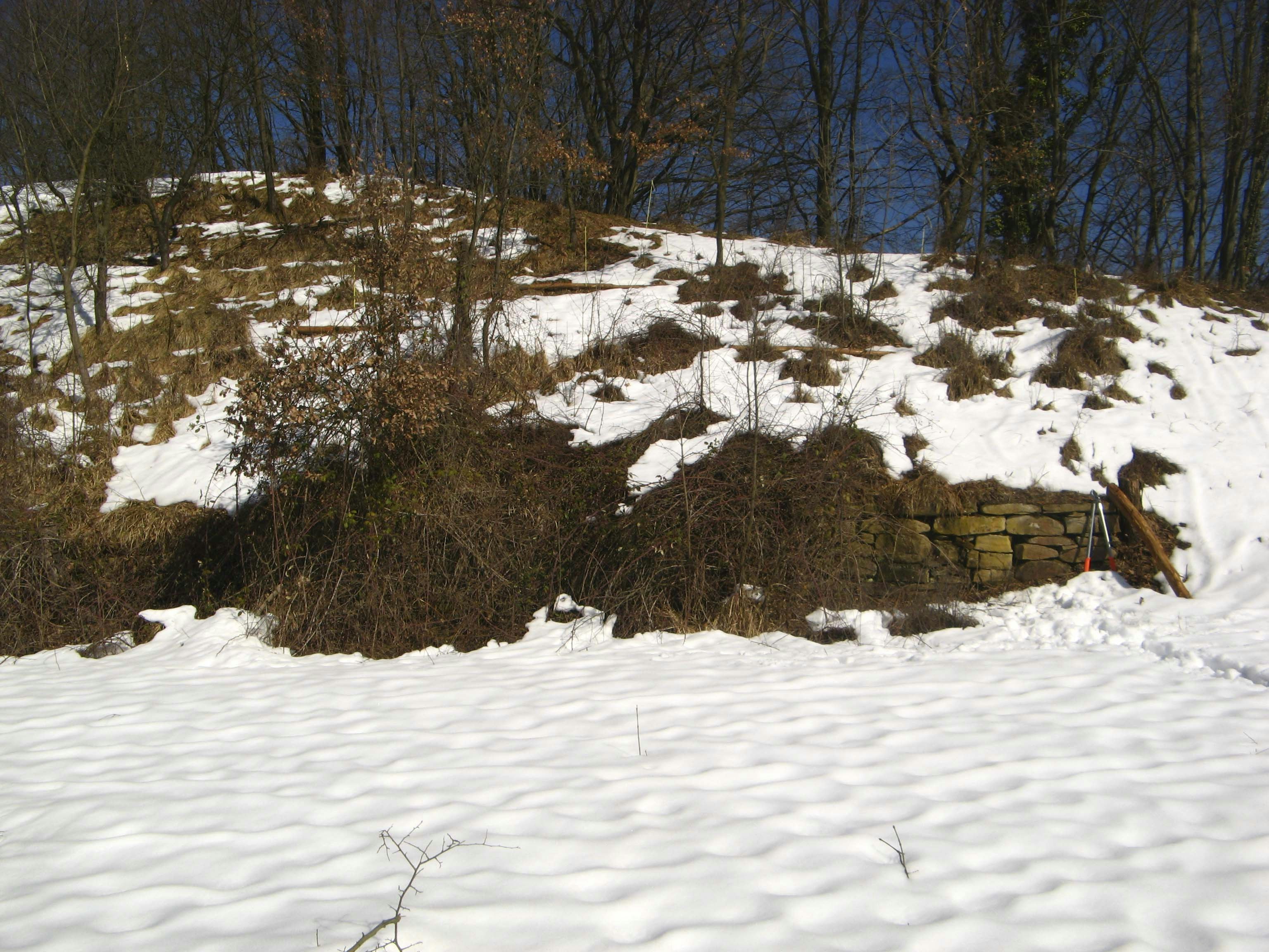 Sul prato erano visibili dei materiali plastici di rivestimento e della ghiaia. La collina è sorretta alla base da un lungo muretto a secco in buono stato di conservazione, quasi completamente ricoperto da vegetazione spontanea, in particolare rovi e prugnoli. Nell’area interessata dall’opera sono presenti diversi alberi di piccole-medie dimensioni: ciliegi in pessimo stato di salute disposti a filari, salici, prugnoli, aceri campestri, querce e ornielli. Oltre ai rovi è notevole la presenza di ginestrelle. Il fondo è interamente ricoperto da una graminacea con foglie molto folte e lunghe. Ci sono alcuni esemplari di ciavardello, viburnum lantana e dafne laureola. Si osservano i segni del passaggio di cinghiali e caprioli.