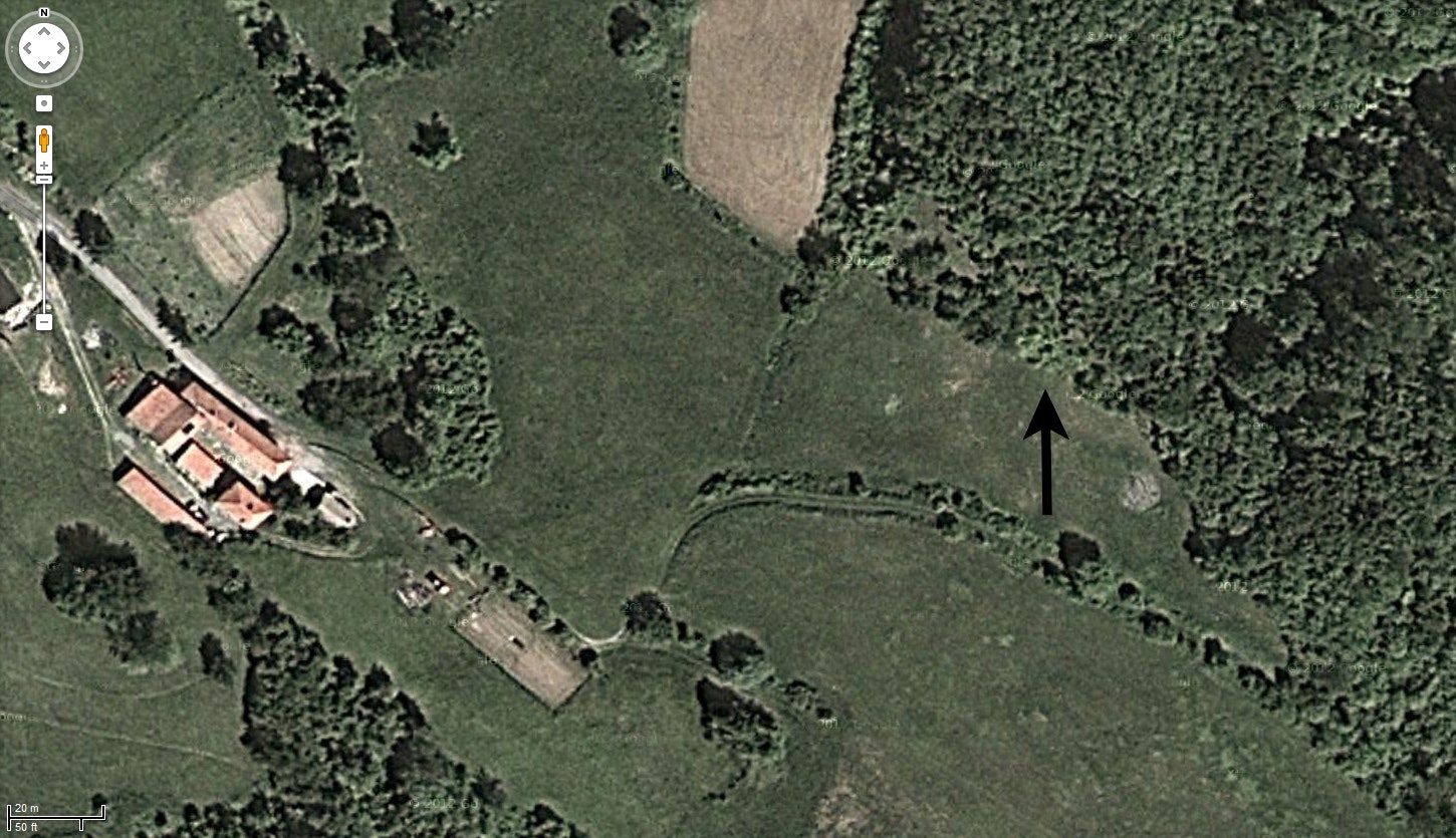 Vista dall’alto di una parte del territorio di Pianpicollo Selvatico, prima della sua trasformazione. La freccia indica l’area individuata per il forest garden.