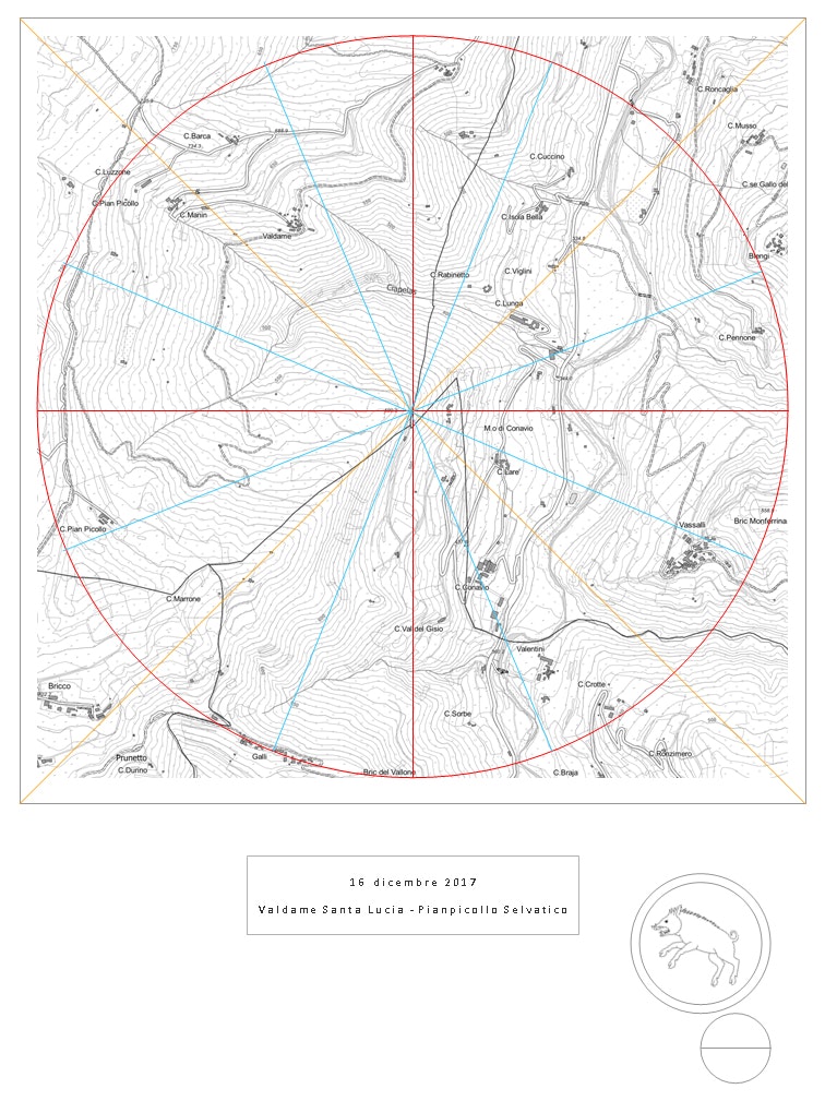 Uno dei principali punti notevoli di osservazione sul territorio è il lembo orientale del Bric delle Forche. Il sito si presta particolarmente per il suo grado di estesa esposizione per un arco superiore ai 180°. In questo sito il mio progetto intende realizzare un’installazione costituita da una grande Pietra semisferica (diametro superiore al metro) sulla quale intendo realizzare l’incisione di una mappa descrittiva che riassuma grazie all’ausilio di un corredo di simboli (petroglifi) i contenuti dei diversi grafici tematici prodotti durante la residenza.